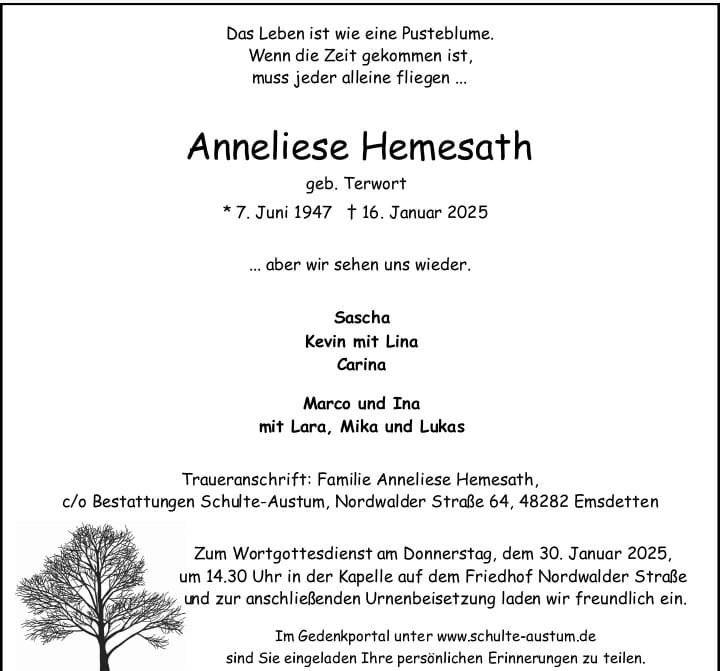 Anneliese Hemesathgestorben am 16. Januar 2025