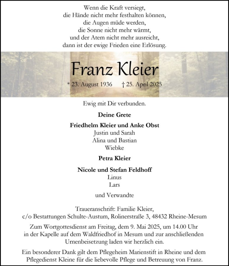 wir wünschen Ihnen von Herzen viel Kraft, dass Sie Menschen um sich haben, die Ihnen in dieser schweren Zeit beistehen und Halt geben. Zusätzlich können Sie auf dieser Gedenkseite Erinnerungen teilen und so das Andenken gemeinsam wachhalten.