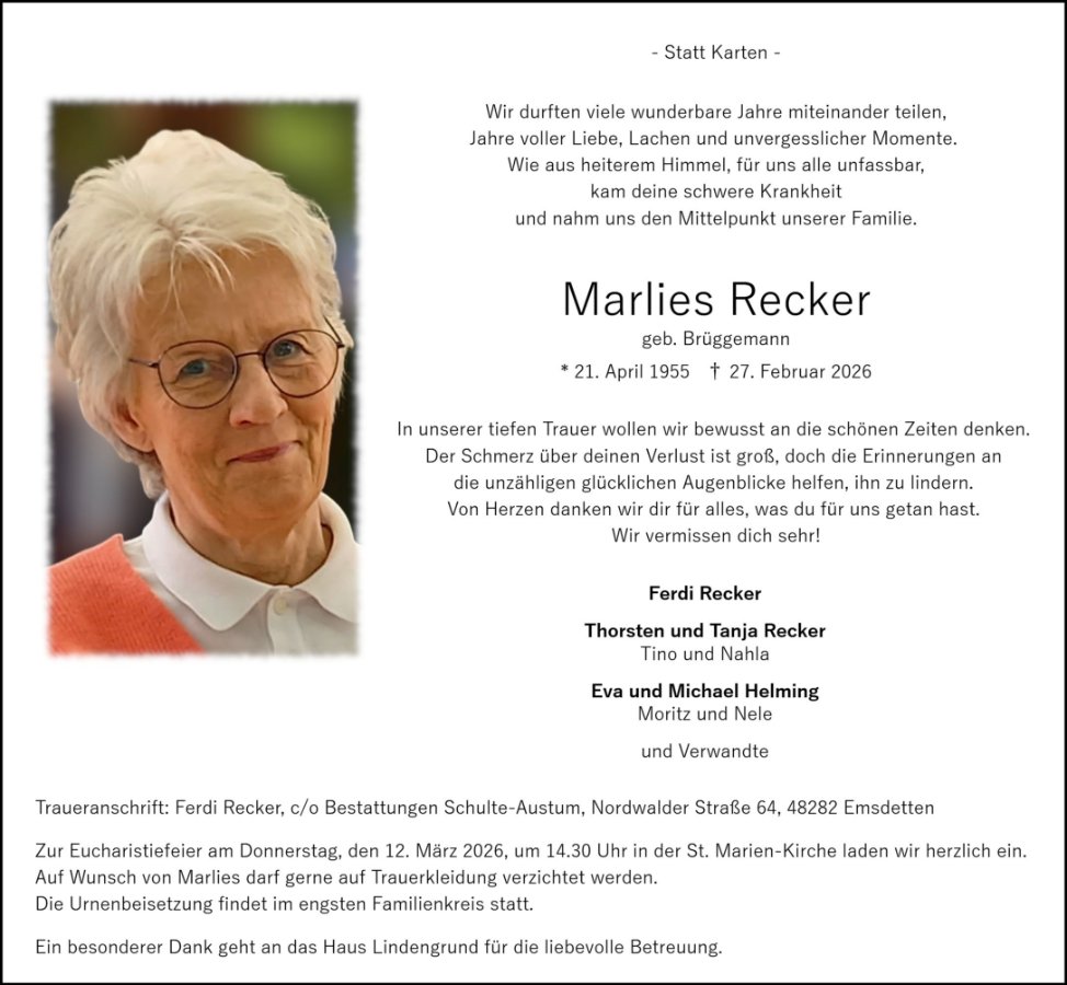 es ist kaum in Worte zu fassen, dass Marlies so plötzlich und tragisch aus dem Leben gerissen wurde.