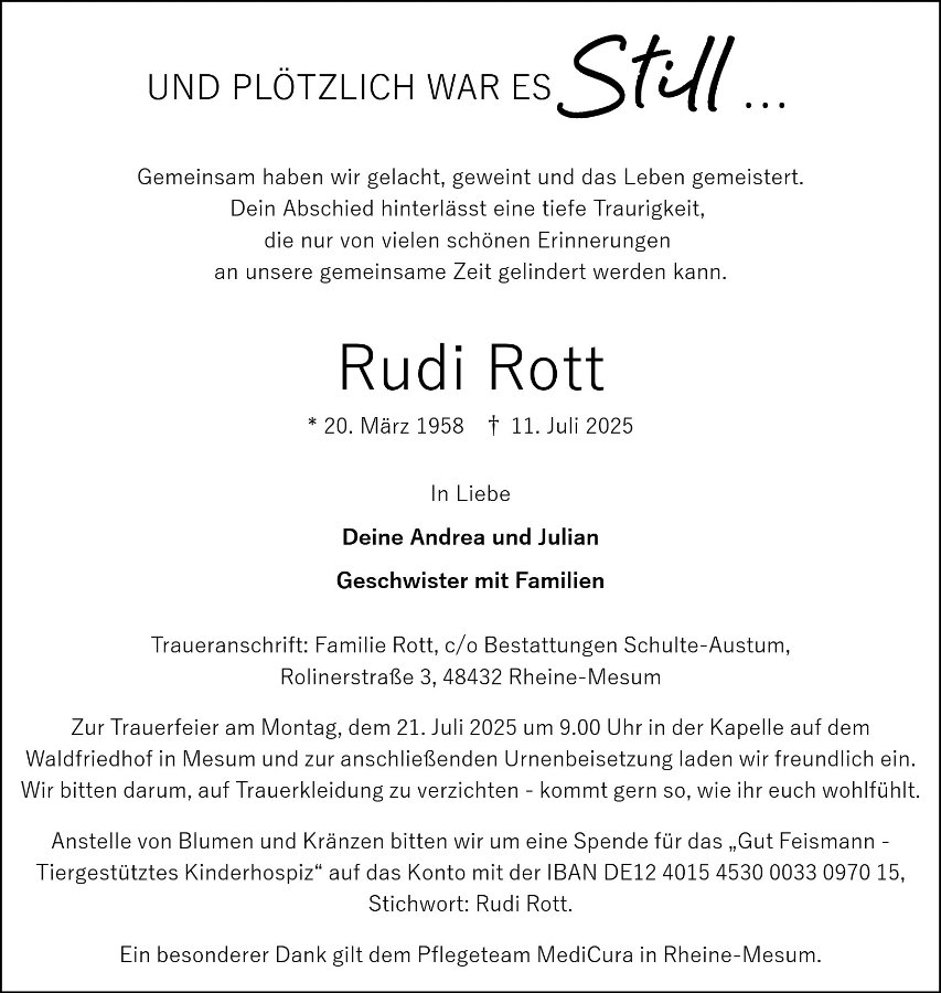 ...viele schöne Erinnerungen an dich, lieber Rudi, werden uns glücklich und traurig machen und dich nie vergessen lassen. Du bleibst für immer in unseren Herzen. Ruhe in Frieden...